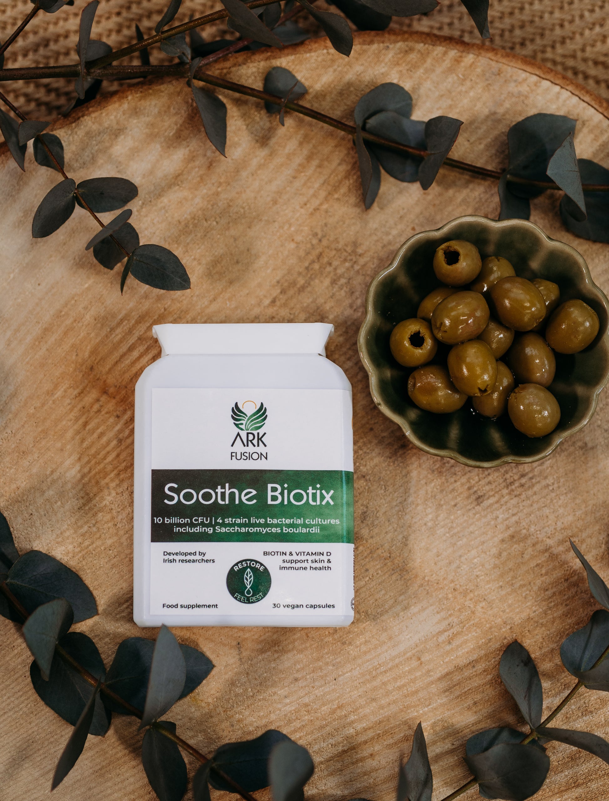 Soothe Biotix: Saccharomyces boulardii, Olive leaf extract, Lactobacillus rhamnosus, L. acidophilus, L. reuteri, Vitamin B7 (Biotin), Vitamin D3 (Cholecalciferol), Hypromellose capsule shell.